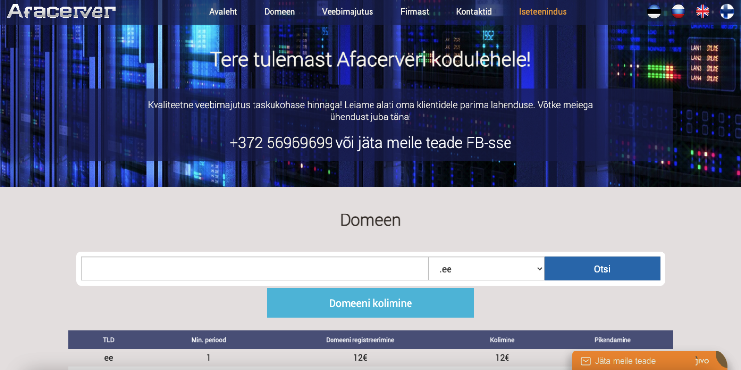 Landing page Afacerver'i veebimajutusele.