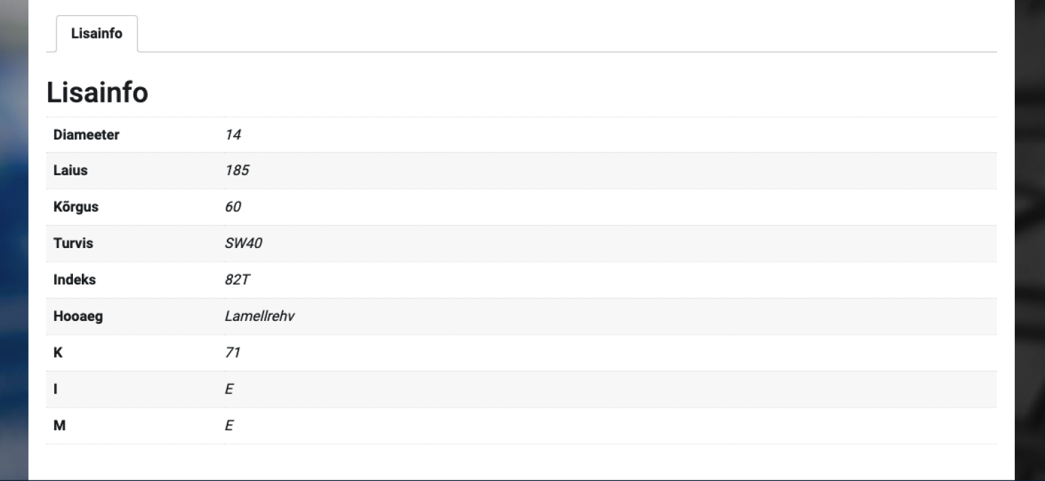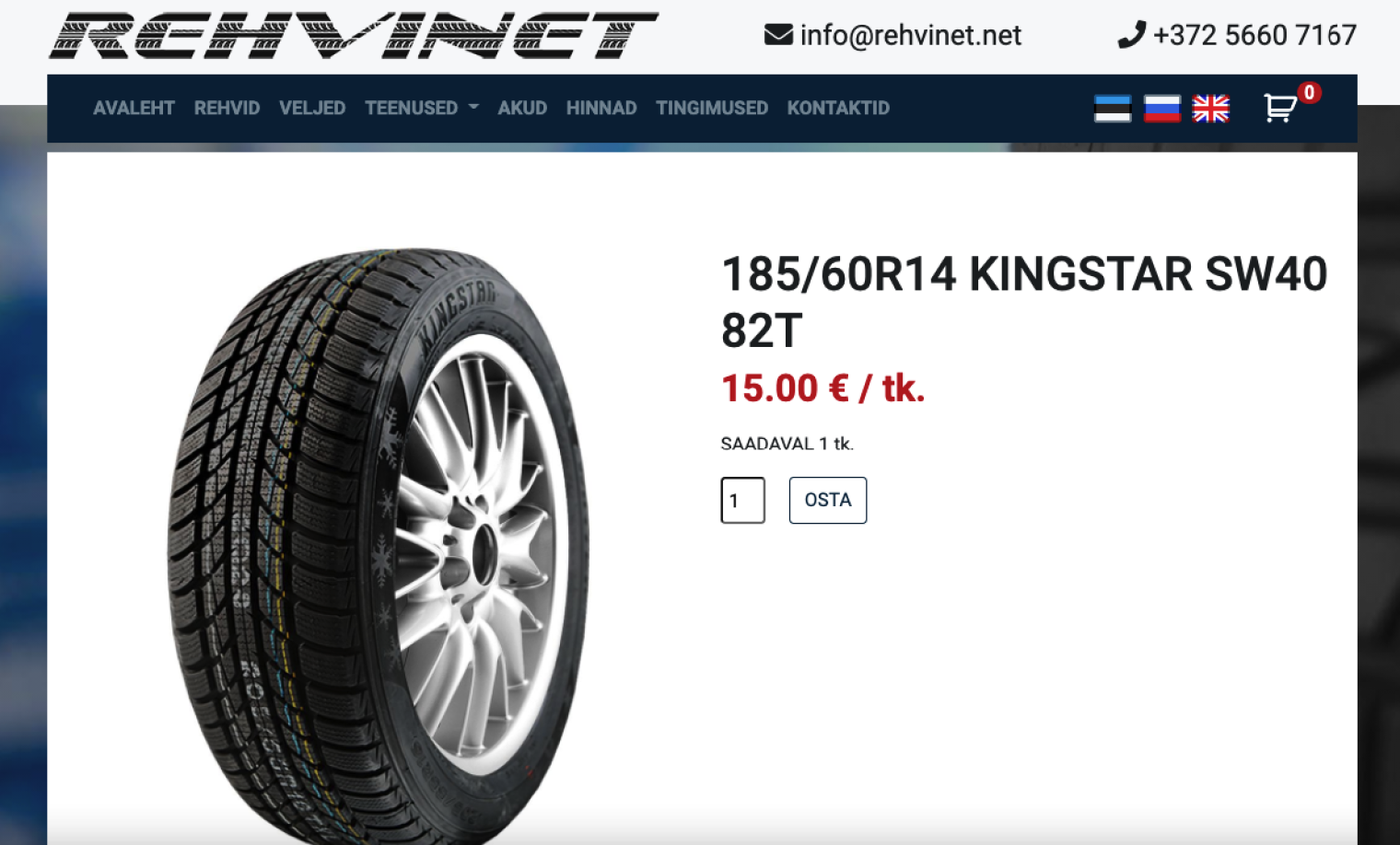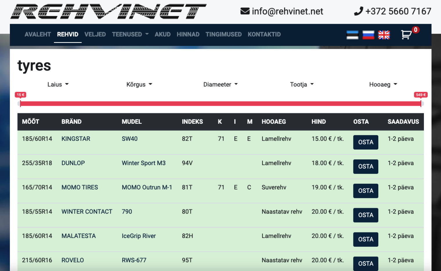 Rehvide / velgede müük. Epood individuaalse funktsionaaliga. Iga 24t tootenimekiri automaatiliselt uuendab. Mugav otsingu filtrid.