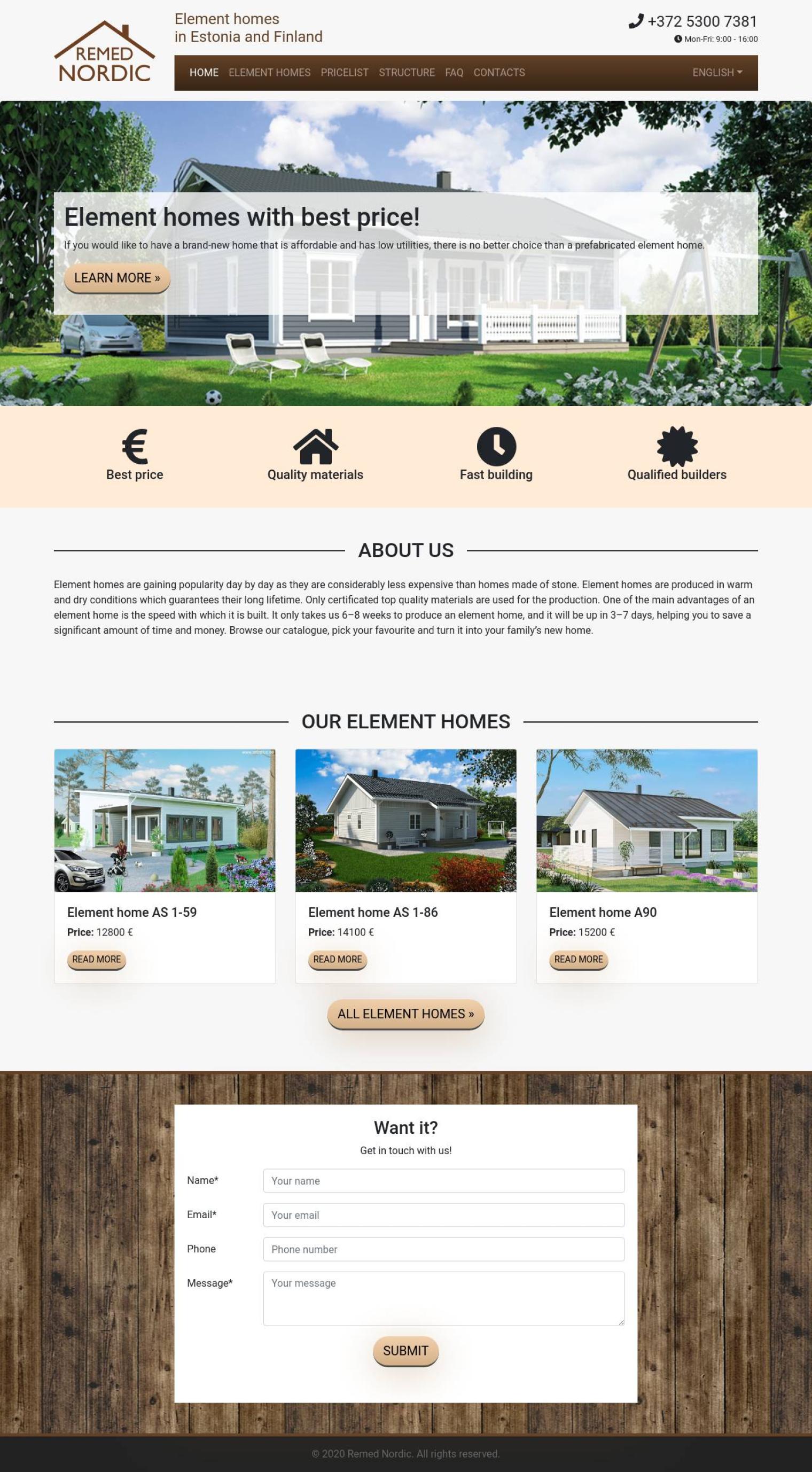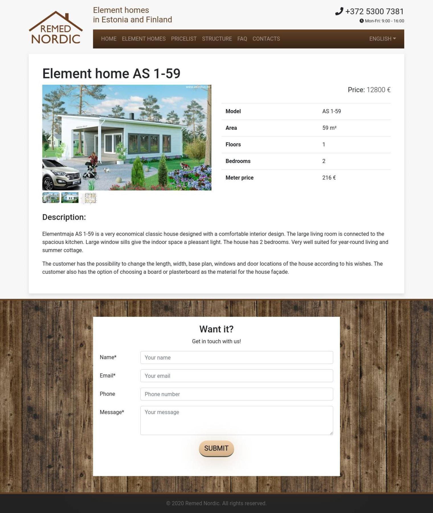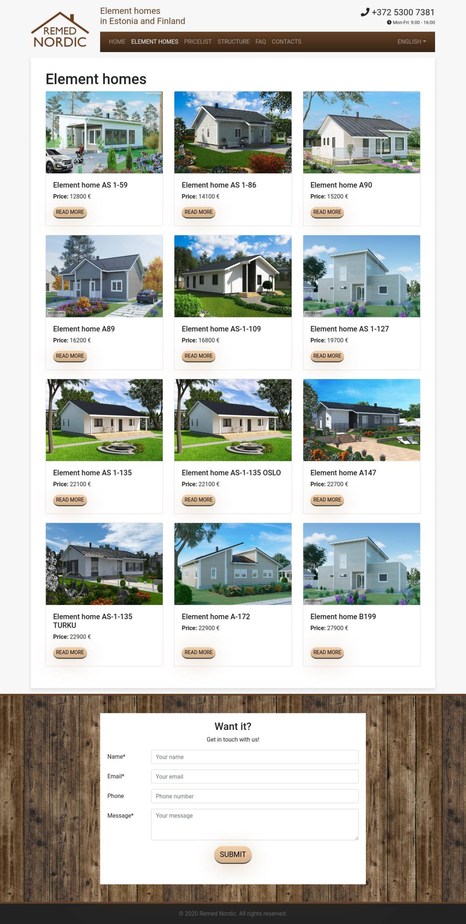 Veebileht elementmajade müügiks. Mugav mitmekeelsus ja mugav funktsionaalsus lisada, eemalda, redigeerida elementmajasid.