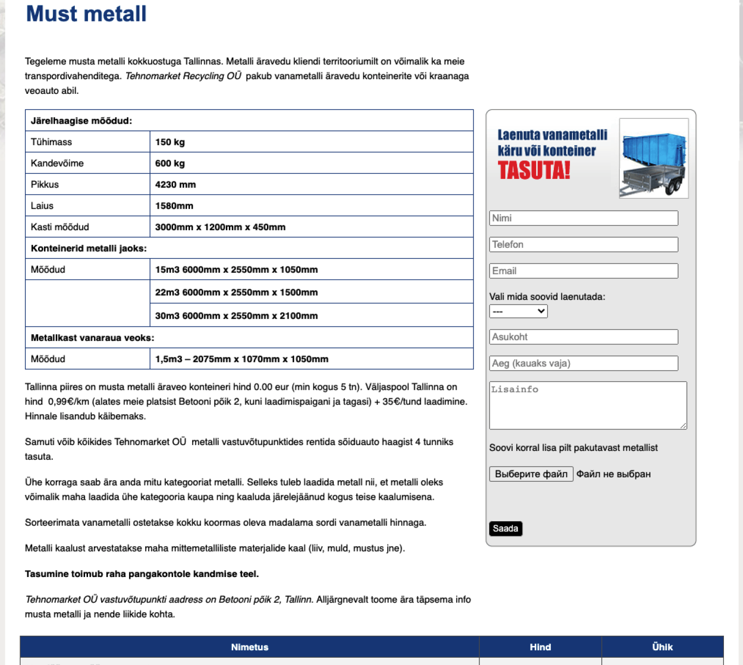 Tehnomarket OÜ põhitegevusalaks on vanametalli ning värviliste ja mustade metallide jäätmete kokkuost ja töötlemine.