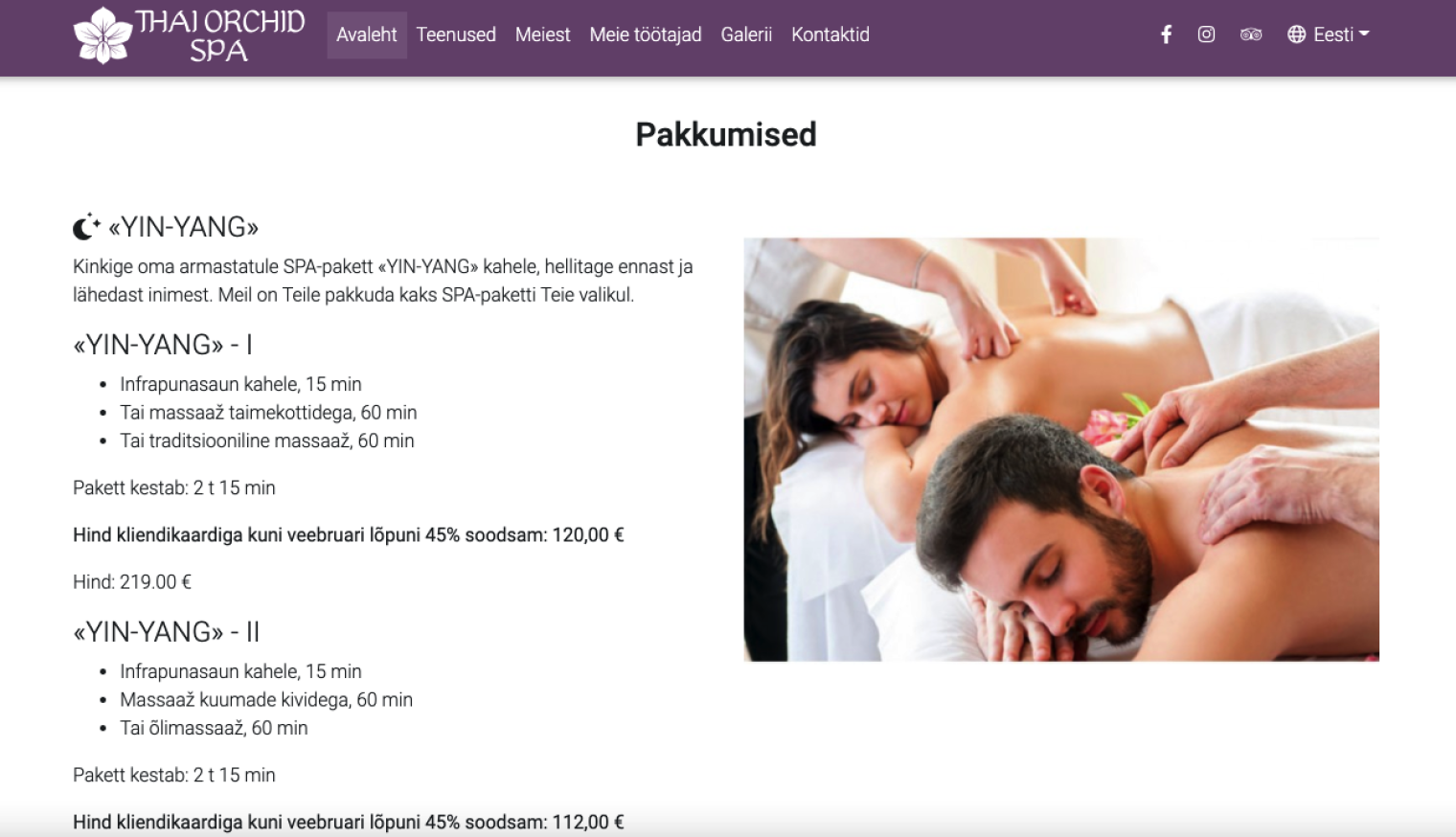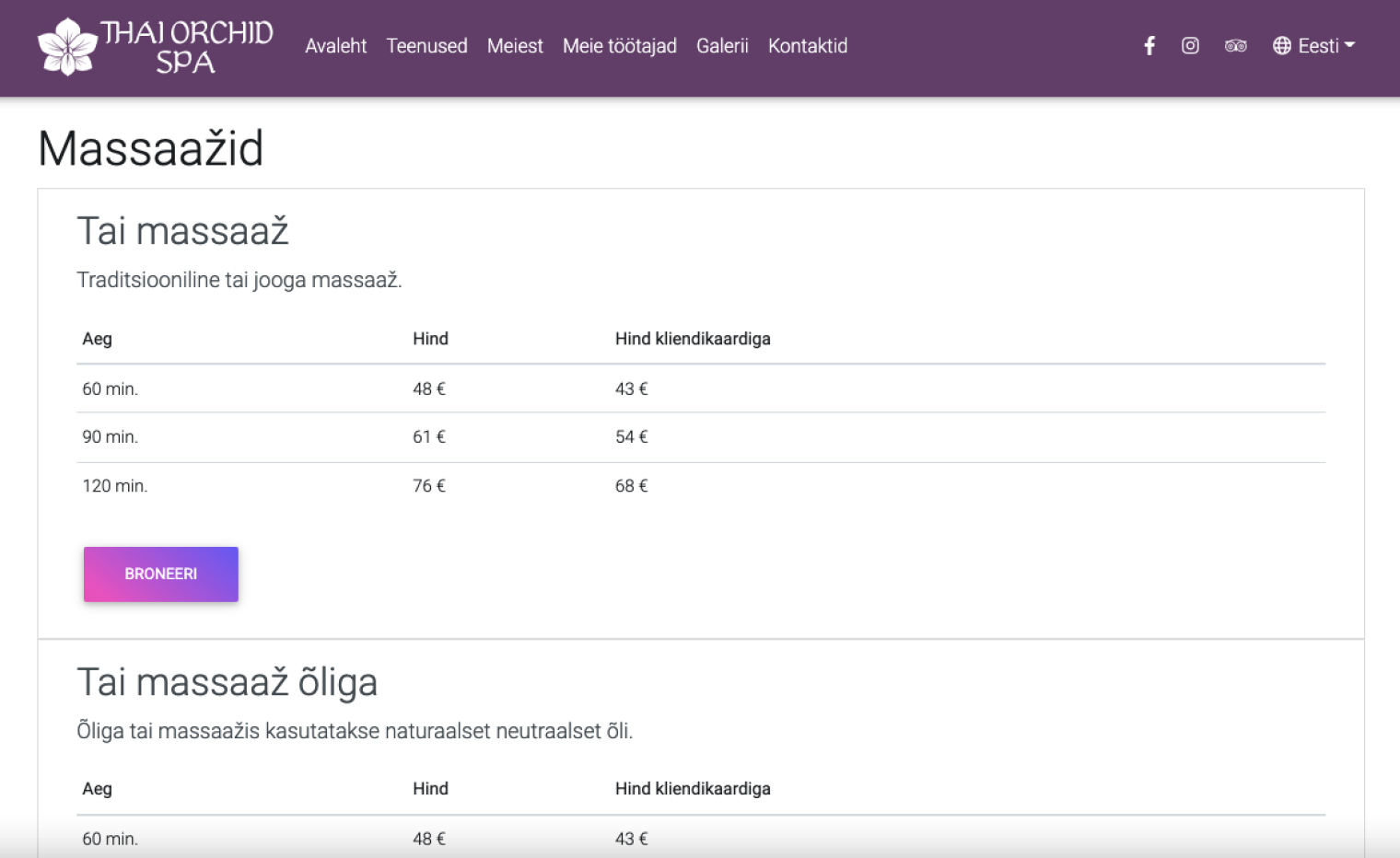 Thai Orchid Spa - massaažisalong Tallinna kesklinnas. Unikaalne funktsionaalsus. Võimalus lisada / redigeerida teenuseid, töötajaid.